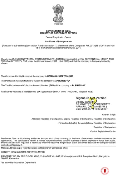 Honeythorn Systems Private Limited Ranka Junction, 3rd Floor, #80/3, Krishnarajapuram R S, Bangalore North, Bangalore- 560016, Karnataka